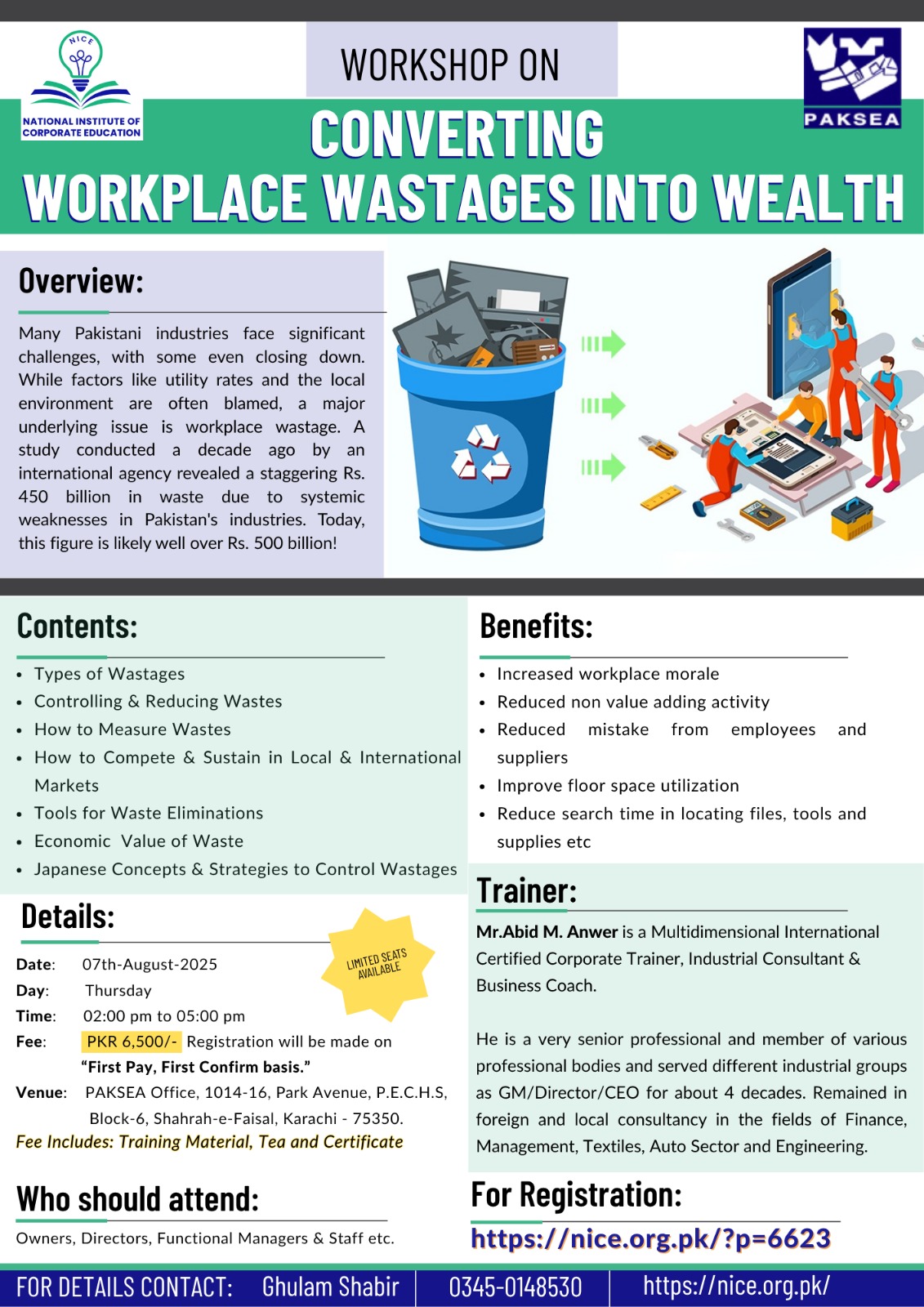 Workplace wastage, not just high utility rates, is a primary reason many Pakistani industries are struggling and closing. A decade-old study revealed Rs. 450 billion in waste due to systemic weaknesses, a figure likely exceeding Rs. 500 billion today. This practical training will equip you with the knowledge and tools to identify, control, and eliminate wastages, helping your business not just survive, but thrive in competitive environments.