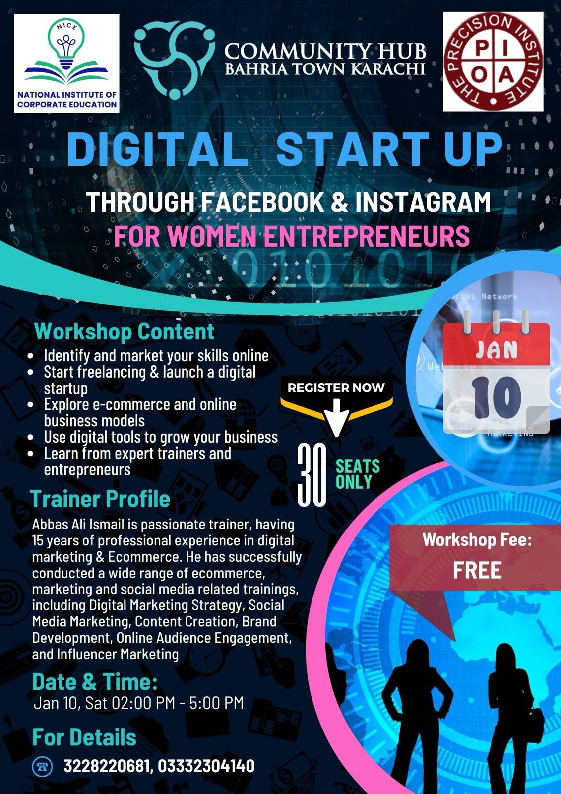 A FREE workshop for women who want to start their own business or launch an online digital start-up. Learn the basics, explore opportunities and take your first step with guidance from experts. This Workshop is being organised in collaboration with Community Hub Bahria Town (CHBTK)  and The Precision Institute.